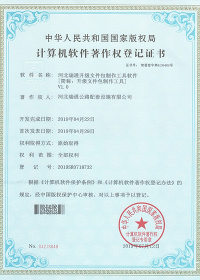 软件著作权登记证书-河北瑞通升级文件包制作工具软件V1.0